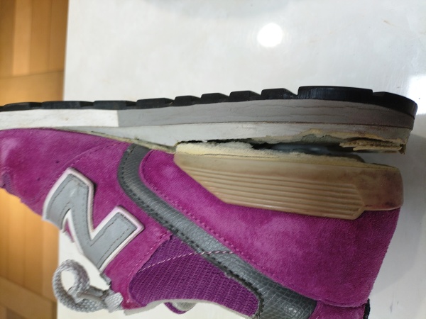 特にニューバランスに多いこの症状、、、 劣化した接着剤を丁寧に取り除き、 ウレタン系の強力な接着剤でしっかりと 圧着することが成功の鍵となります。